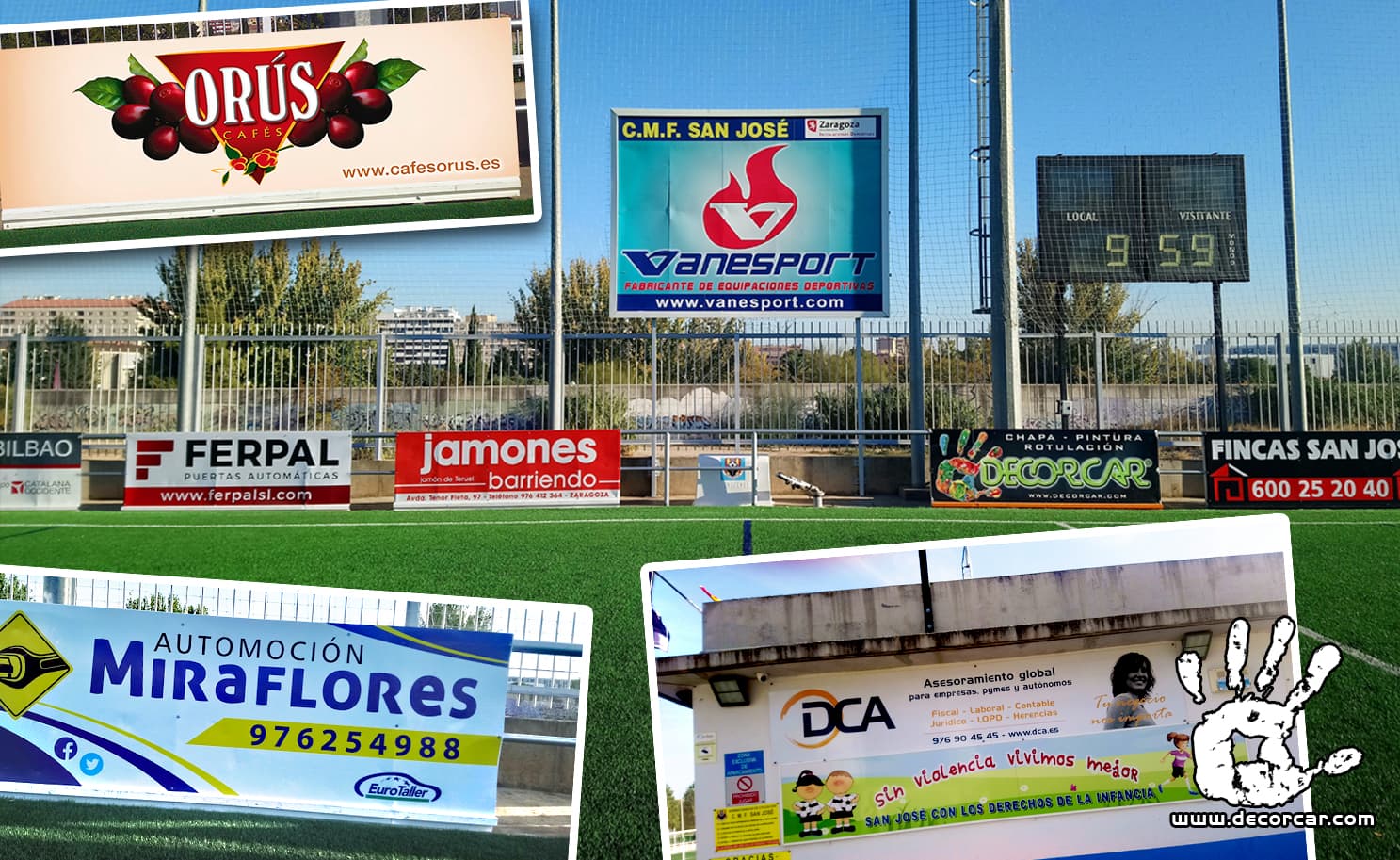 Decorcar. Diseño, rotulación y renovación de cartelería exterior publicitaria de campo de fútbol con impresión digital.