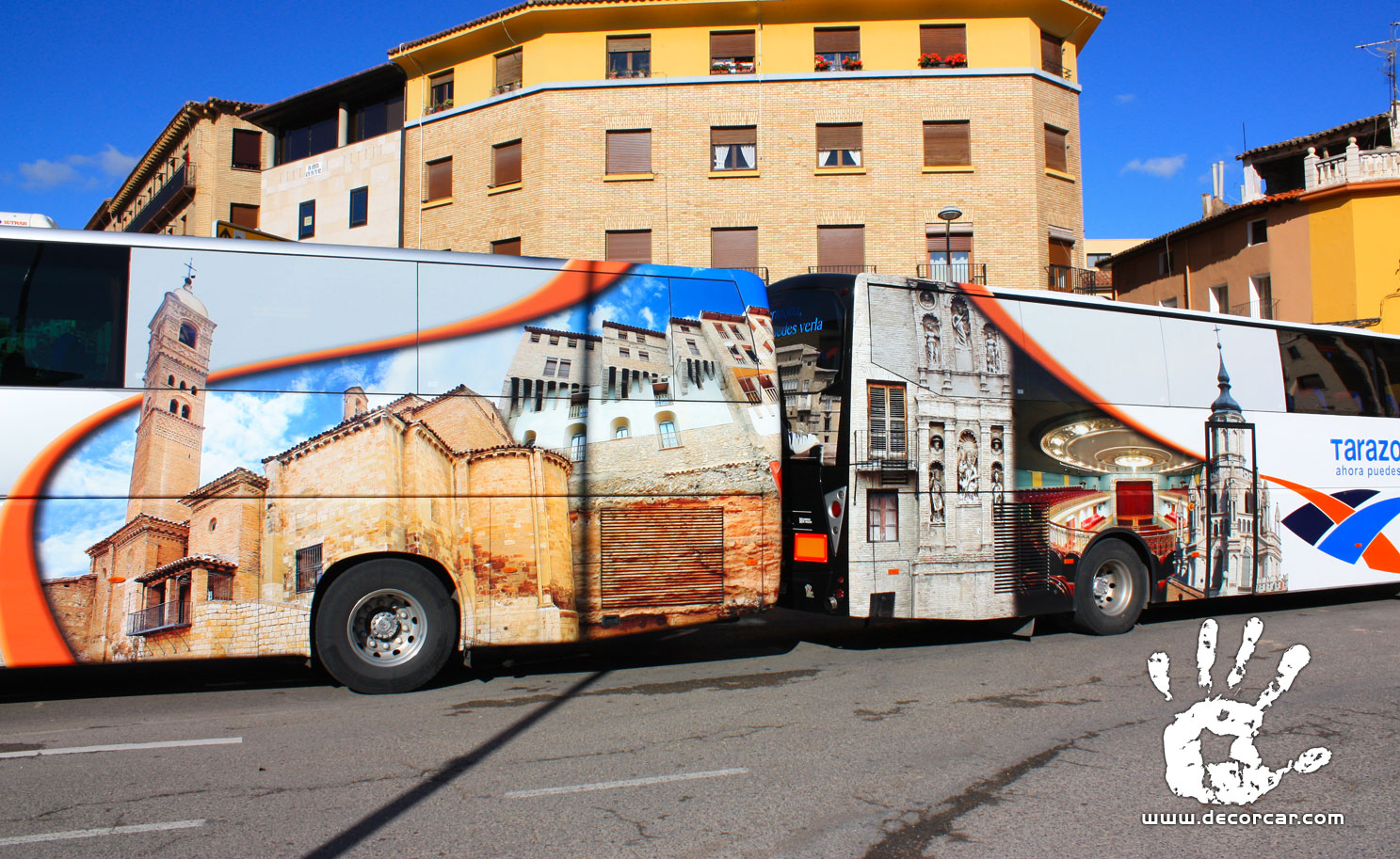Diseño y rotulación de dos autobuses para la promoción de Tarazona. Se ha utilizado vinilo de alta gama impreso y vinilo microperforado impreso homologado para los cristales.